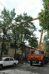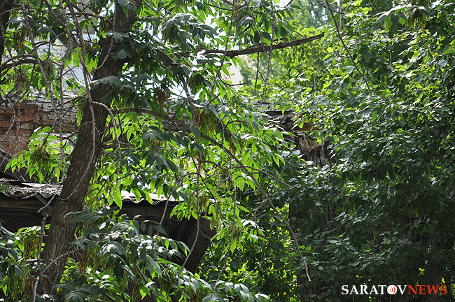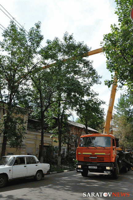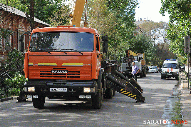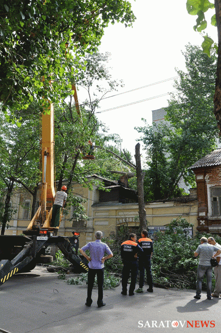Старинный дом по адресу Соборная, 36 в Саратове пострадал от падения дерева. Ему на крышу упал толстый ствол тополя. Сейчас на месте работает "вышка": дерево распиливают и снимают с крыши. Из-за этого улица Соборная полностью перекрыта для проезда автотранспорта от Волжской до Первомайской.