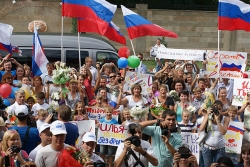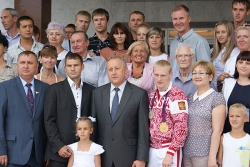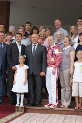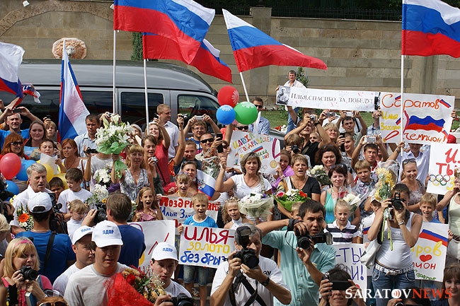 Илья Захаров в сопровождении своего тренера Татьяны Коробко и невесты вернулся на родину в 10:50 утра. Его встречали десятки журналистов, родственников и близких, а также юные воспитанники спортивных школ.