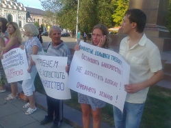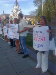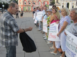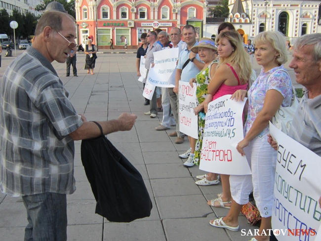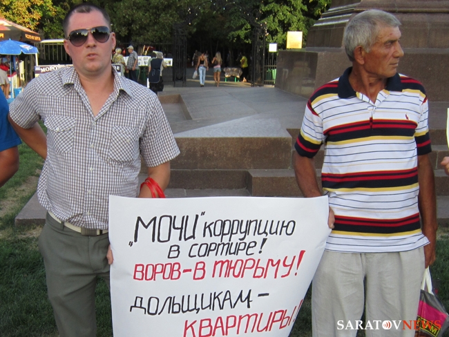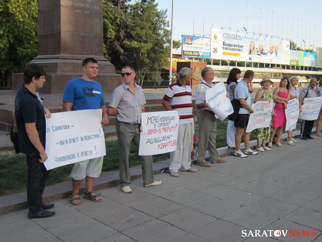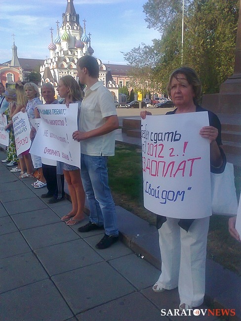 Вчера в Саратове около 19.00 возле памятника Чернышевскому состоялся пикет обманутых дольщиков. Люди, купившие квартиры в ЖСК "Свой дом" - домах №4 и №5 жилой группы №10 в Новосоколовогорском поселке, живут в них уже пять лет, не имея права оформить квартиры в собственность, так как спорные дома построены, в том числе на земле, не указанной в строительной документации.