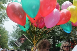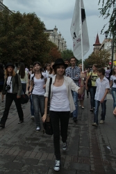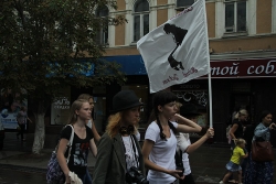 Саратовские фанаты собрались у Липок в 15.00, чтобы начать праздничное шествие по проспекту. Группу молодых и взрослых людей нельзя было спутать ни с кем другим - футболки, сумки, флажки, урашения с поп-иконой на каждом из идущих, знамя с именем звезды в руках у девушки во главе, а в центре (и группы, и внимания окружающих) - двойник знаменитого певца в черном костюме, солнцезащитных очках и парике, имитирующем прическу именинника. Музыку ребятам обеспечил маленький серый бумбокс.