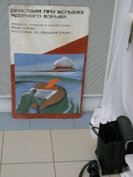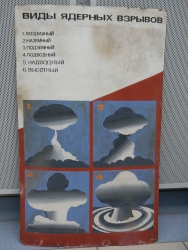 Иллюстративным материалом для выставки стали также советские плакаты посвященные гражданской обороне - это идея москвичей. Они настоящие, вынесенные из заброшенных подземелий, испорченные водой и временем. На них подробные инструкции, как вести себя во время ядерного взрыва, что делать с пострадавшим товарищем, призывы "не болтать" и прочее.