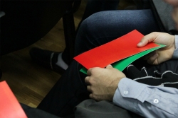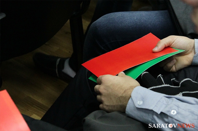 Студенты также поделились с представительными гостями своими мнениями по поводу предлагаемых федеральных законов и провели "игровое" голосование зелеными и красными карточками.