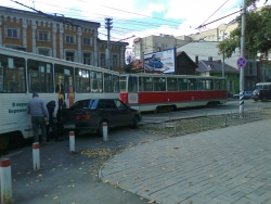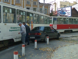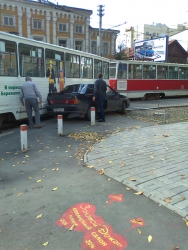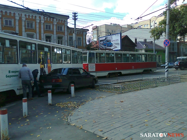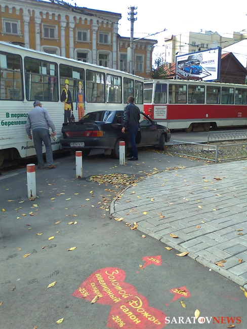 Около часа назад в центре Саратова произошло ДТП. На пересечении Советской и Мирного переулка "ВАЗ-2115" пытался объехать справа трамвай, который поворачивал. Однако, завершить маневр водителю не удалось, трамвай врезался автомобилю в заднюю часть. На месте ЧП затор.