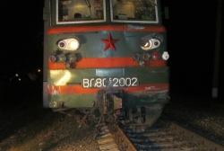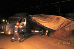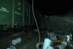 В результате столкновения локомотив грузового состава сошел с рельс, повредив две опоры контактной сети. Вагоны с рельс не сошли. Повреждений груза нет. Фура опрокинулась на стоящий рядом автомобиль "ВАЗ-2109" под управлением 19-летнего водителя.