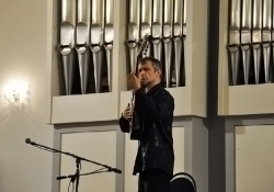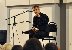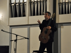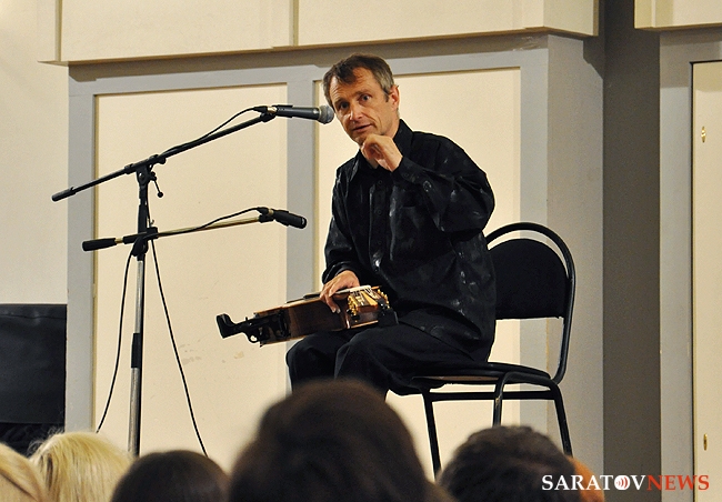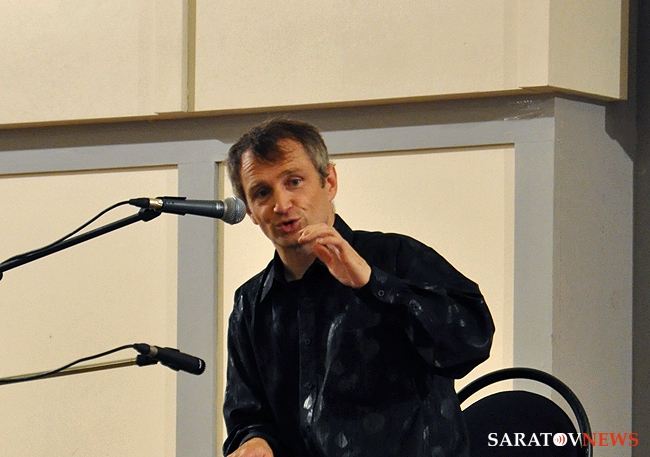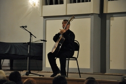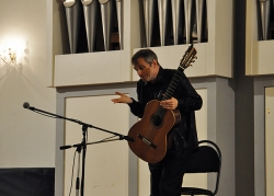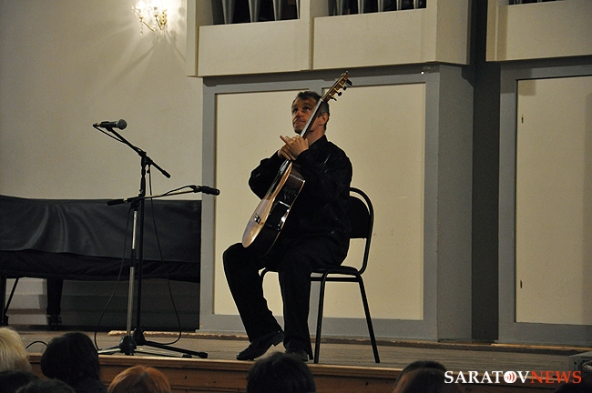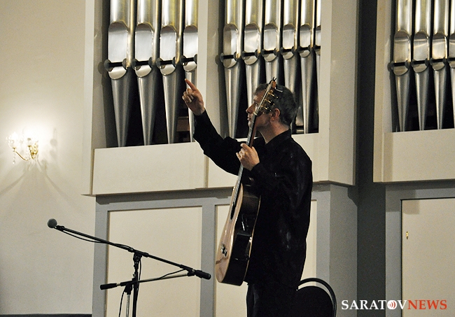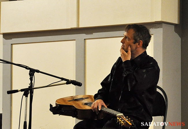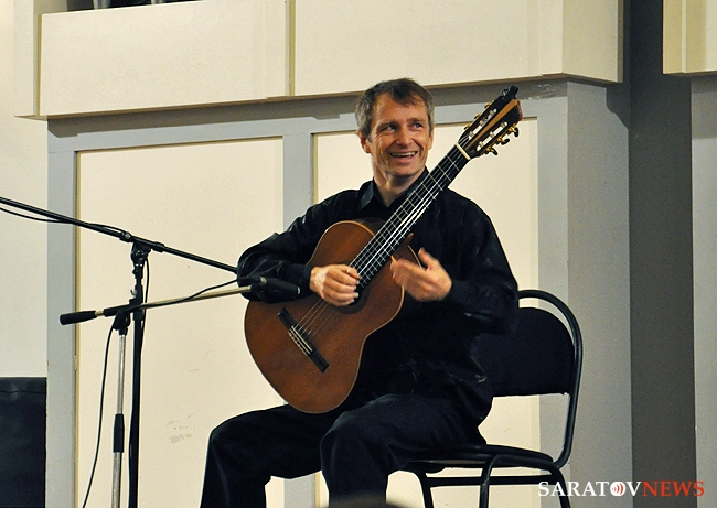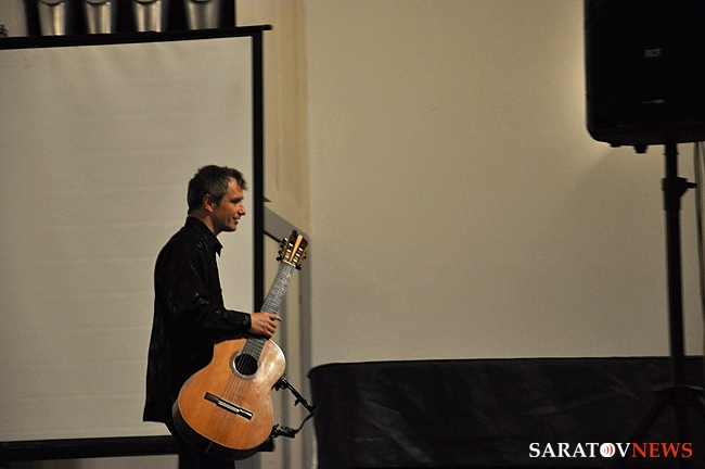 Вчера в Большом зале Саратовской консерватории состоялся концерт французского гитариста-виртуоза Филиппа Вилла. В его программе были заявлены произведения испанских, итальянских и аргентинских композиторов. Однако музыкант не захотел себя ограничивать. С самого начала он свободно общался с аудиторией по-русски и старался сделать концерт интерактивным. Так, он внезапно заметил, что стены Большого зала украшены барельефами великих композиторов, и затеял музыкальный диалог с портретом Петра Чайковского. Он рассказал, что в одном из произведений Петра Ильича слышит тему "Шербурских зонтиков", которые, в свою очередь, напоминают ему мелодию "Подмосковные вечера", и немедленно сыграл импровизацию, построенную на переплетении этих двух популярных тем. Русский язык Филипп, по его собственному признанию, учил по советским мультфильмам и не переставал удивляться тому, что в России его речь понимают и рассказал, что обычно русские собеседники вначале зовут его мсье Филипп, потом Филиппушка, и, наконец - Филипок.