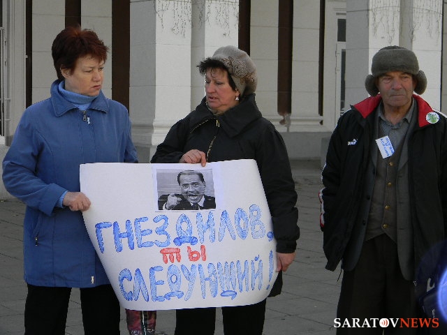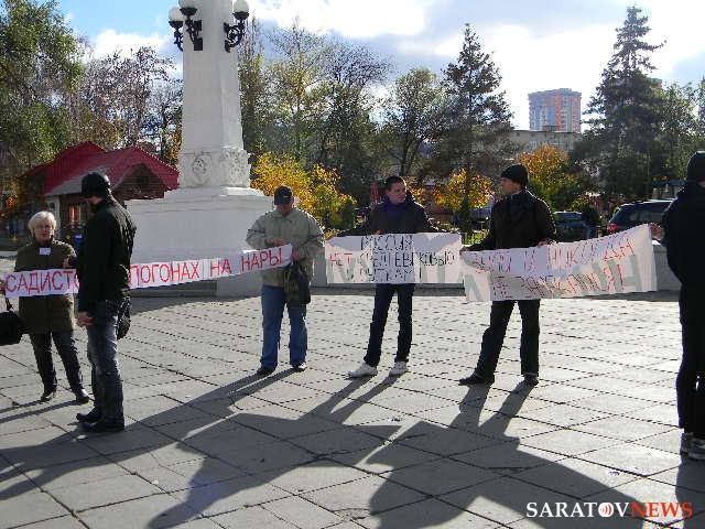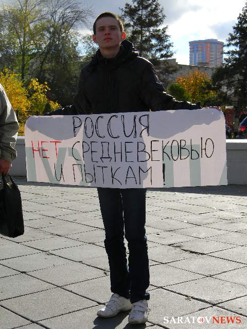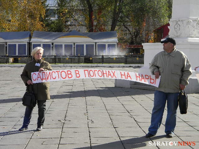 27 октября в 11.00 у кинотеатра "Победа" состоялся пикет против насилия над заключенными, организованный Ларисой Сотниковой - матерью 24-летнего Артема Сотникова, убитого в энгельсской ИК-13 . Немногочисленные участники акции вышли с плакатами "Свободу Виктору Синаюку", "Садистов в погонах на нары", "Гнездилов - ты следующий", "Знай и никогда не зарекайся", "Россия, нет средневековью и пыткам".