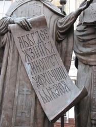Доктор исторических наук профессор Института истории и международных отношений СГУ имени Н.Г. Чернышевского Владимир Кащеев обнаружил ошибку на памятнике святым Кириллу и Мефодию, который находится перед 10 корпусом Саратовского государственного университета. Как сообщил Владимир Иванович в телефонной беседе с корреспондентом Saratovnews, неточность закралась в современный алфавит, свиток с которым один из создателей славянской азбуки держит в руках.