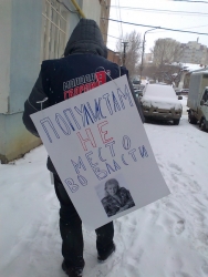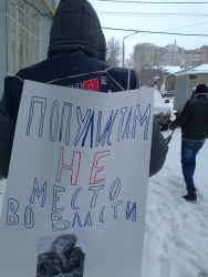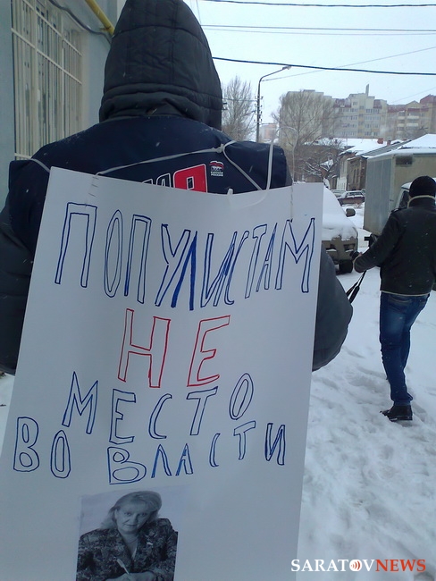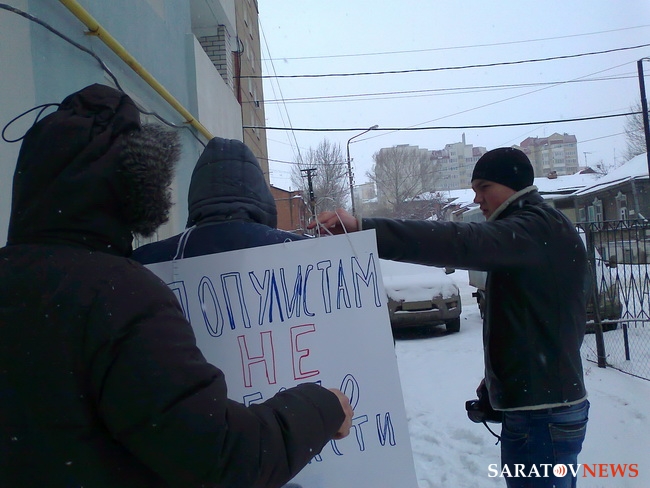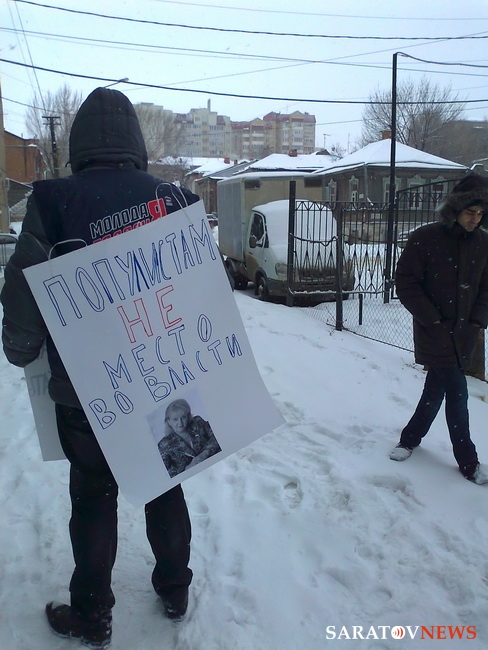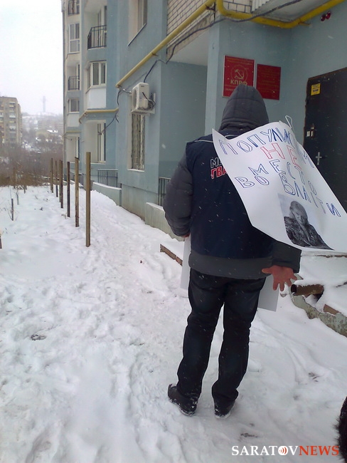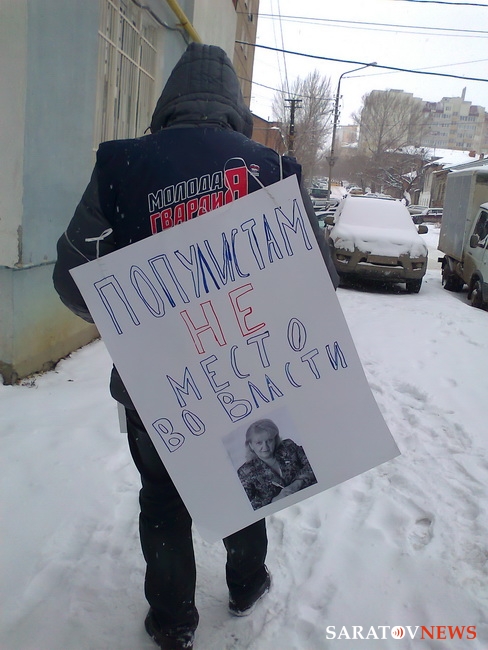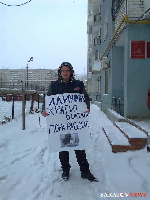Сегодня, 24 января, в 12.00 у здания саратовского регионального отделения "Коммунистической партии Российской Федерации" состоялся одиночный пикет, проведенный активистом "Молодой гвардии". Он держал в руках два плаката, лозунг на одном из которых гласил: "Алимова, хватит болтать, пора работать".