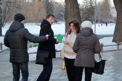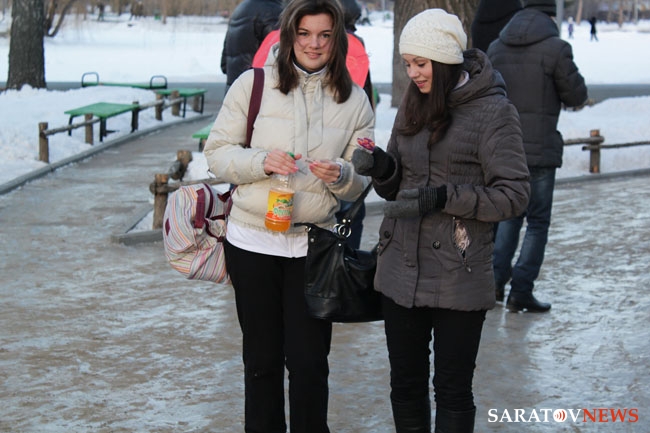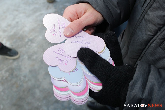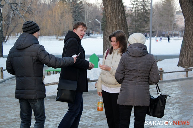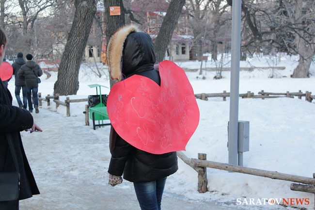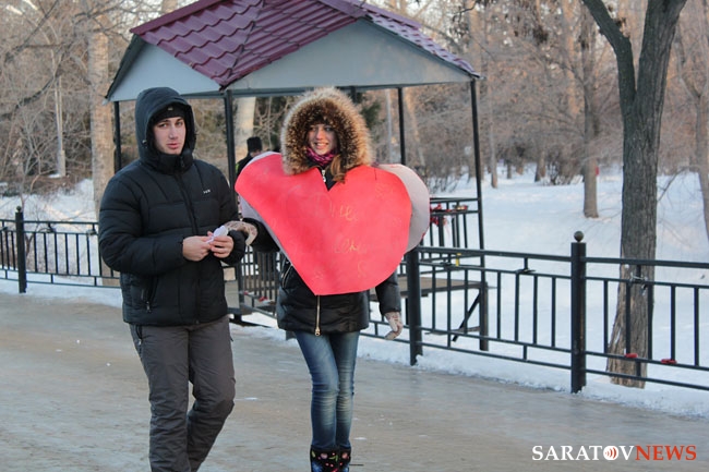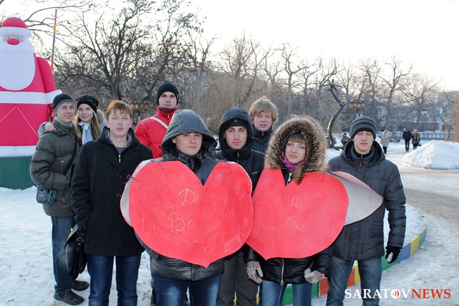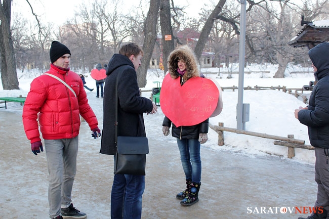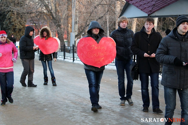 Вчера в городском парке Саратова прошла акция, приуроченная ко Дню Святого Валентина. Девять молодых ребят, трое из которых были одеты в костюмы "Валентинов", раздавали всем прохожим открытки с пожеланиями. В ходе мероприятия активисты "осчастливили" около 40 взрослых и детей.