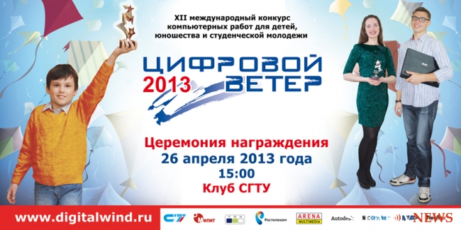 ОАО "Ростелеком" выступил официальным партнером международного конкурса компьютерных работ для детей, юношества и студенческой молодежи "Цифровой ветер-2013", который проводится Саратовским государственным техническим университетом имени Гагарина Ю.А. Для участия в конкурсе зарегистрировано 3020 работ более чем из 200 городов России, Украины, Белоруссии, Казахстана, Болгарии, Индии, Швеции, Германии (всего 11 стран).