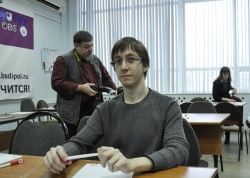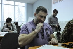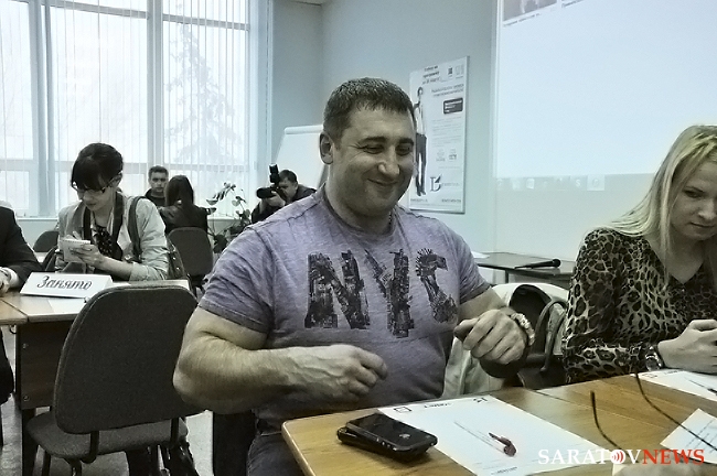 Вячеслав Максюта работал над проверкой своего диктанта дольше и вдумчивее всех, однако свои шансы оценил "между тройкой и четверкой", так как с расстановкой знаков препинания всегда испытывал особенные сложности, а в тексте Рубиной "пунктуация на пунктуации". На вопрос, не хочет ли он в качестве алаверды устроить в Саратове экзамен на уровень физической подготовки, Вячеслав ответил, что такие испытания проводит уже давно. "У меня ощущение, что сейчас в школе учатся одни ботаники. Проверяли всех на подтягивании – наставили двоек", – признался пауэрлифтер.