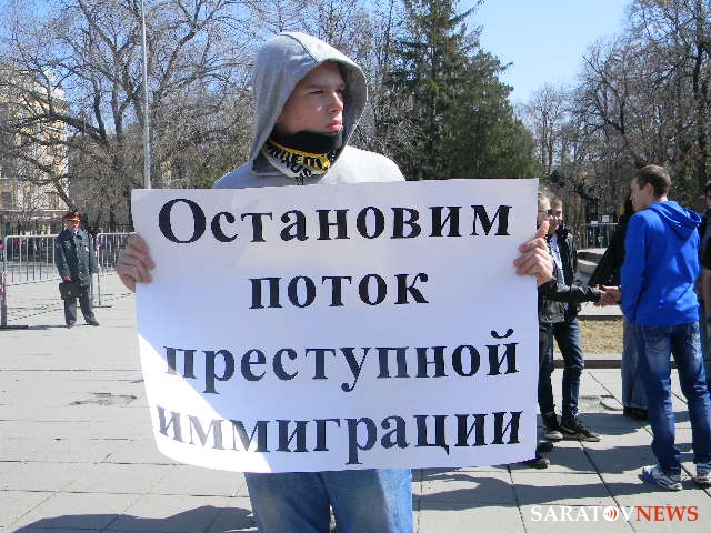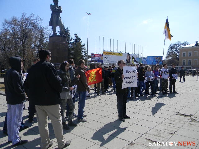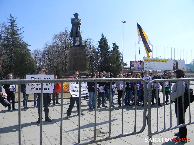 В течение часа молодые люди скандировали различные речевки, в том числе и такие парадоксальные (основные участники - школьники): "Стоп убийству наших детей". Также ребята напоминали: "Саратов - не Кавказ", заявляли "Стоп мигрантам", "Нас мало, но мы едины", "Сегодня нас 100, а завтра нас 1000", "Границу на замок", "Даешь визу с Азией", "Меньше мигрантов - меньше убийств" вспоминали Кирилла Буркова. Они требовали также наказания для убийц, которые, по их мнению, в большинстве случаев его избегают.