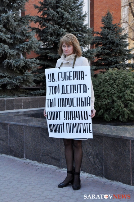 Сегодня перед началом заседания Саратовской областной думы, которое должно открыться докладом губернатора Валерия Радаева о работе правительства в 2012 году, у входа в здание думы прошел одиночный пикет. Представительница лодочников и яхтсменов Зеленого острова стояла с плакатом "Ув. губернатор! Депутаты! Парусный спорт уничтожают! Помогите". Сотрудники безопасности парламента просили ее удалиться, неподалеку дежурили трое полицейских, но никаких активных действий не предпринимали.