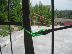 Закрыты не только ворота, но и перевязаны колючей проволокой большие щели чугунной решетки, через которые можно было бы по русской традиции пролезть. Добропорядочные граждане вынуждены повернуть обратно и искать обходные пути. А мальчишек эта преграда не останавливает – они перелезают через забор, рискуя свернуть шею и порвать штаны. Лестница является муниципальным имуществом, но ни горадминистрация, ни руководство Волжского района, ни дорожный комитет, не имеют отношения к закрытию прохода.
