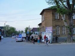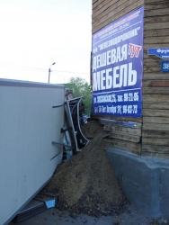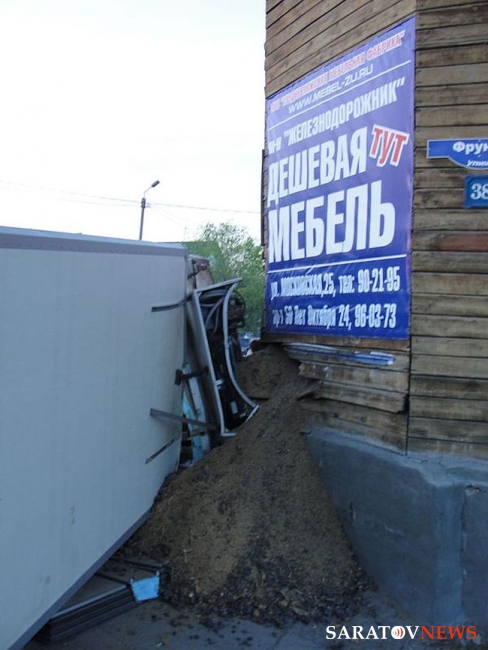 Рефрижератор ехал по улице Фрунзе со стороны улицы Крупской и сошел с трассы при повороте налево. Грузовик преодолел все ограждения и остановился лишь встретив угол дома. Удар смял кабину иномарки, она опрокинулась и повредила кузов. Люди в данном ДТП не пострадали.