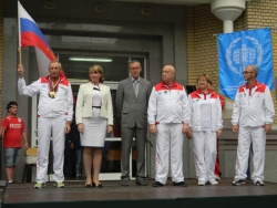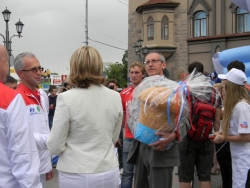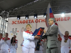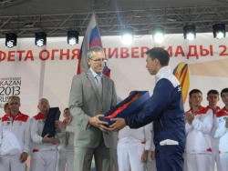 В конце мероприятия были вручены памятные подарки. Леонид Коссович и Наиля Бриленок получили сувенирные факелы, а руководителю аппарата – советник генерального директора АНО "Исполнительная дирекция "Казань 2013" Ларисе Сулима подарили каравай.