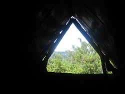 Подъезды стоят открытые: как старые деревянные, так и домофонные двери нараспашку - в домах до сих пор нет электричества, внутри сыро и пахнет гарью. В четвертом подъезде из-под старой, нетронутой огнем части крыши можно выйти на открытую пока ремонтирующуюся часть кровли со свежими стропилами. "Еще три дня, и на этом участке все будет доделано", - сообщает один из работников.