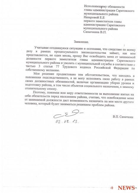 "Учитывая создавшуюся ситуацию и осознавая, что следствие по моему делу в рамках процессуального законодательства займет, как мне представляется не один месяц, прошу освободить меня от занимаемой должности первого заместителя главы администрации Саратовского муниципального района и уволить с муниципальной службы в соответствии с частью 3 статьи 77 Трудового кодекса РФ по собственному желанию.