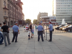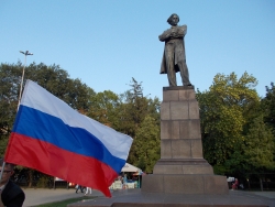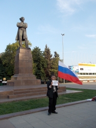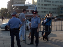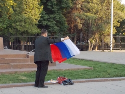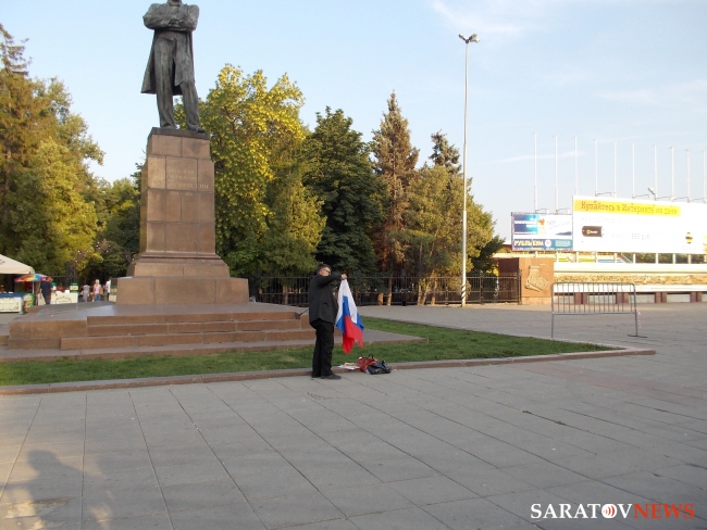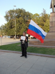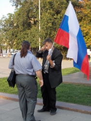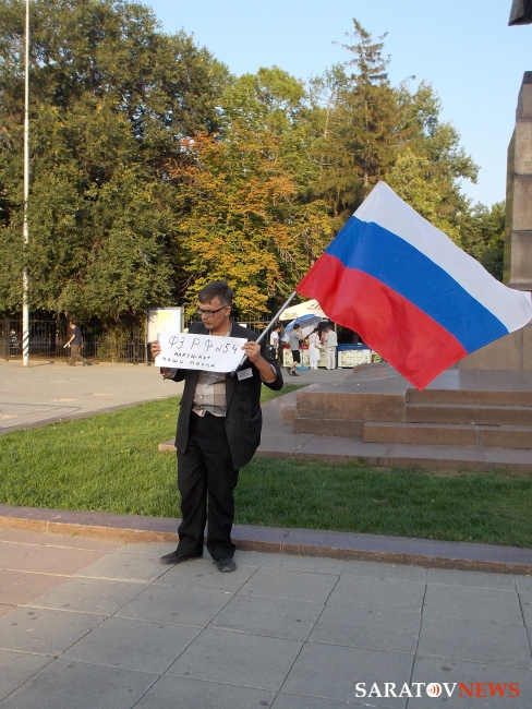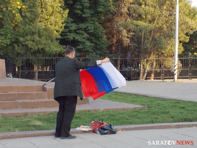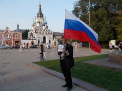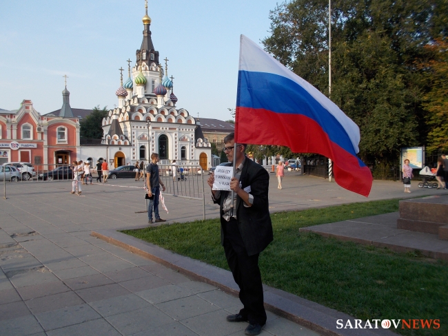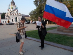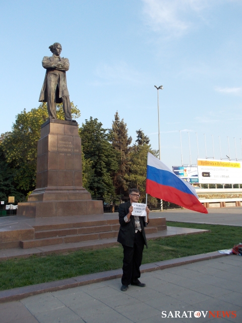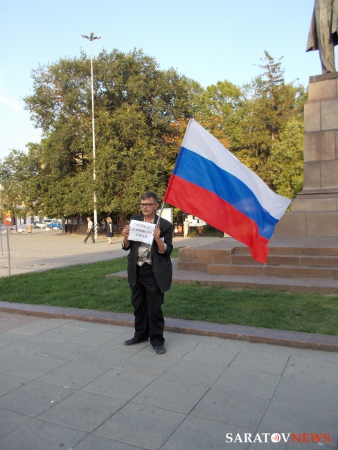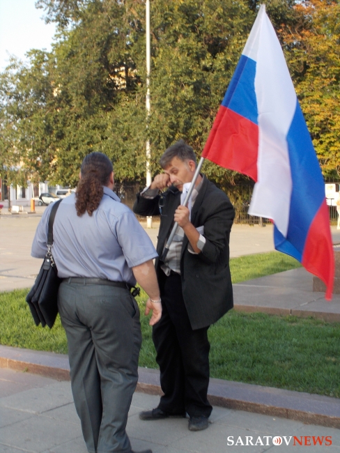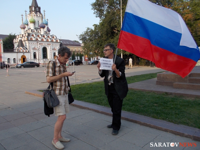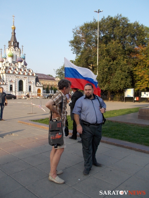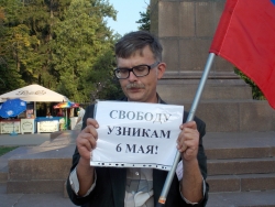 Вечером 6 августа на площади Чернышевского прошла акция в защиту "узников 6 мая". Здесь под присмотром полиции и журналистов, с российским флагом в одной руке и плакатами в другой стоял гражданский активист Андрей Калашников.