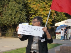 Мужчина держал перед собой лист с призывом "Свободу узникам 6 мая". Затем он поменял его на "ФЗ РФ № 54 нарушает наши права". Это закон "О собраниях, митингах, демонстрациях, шествиях и пикетированиях", регламентирующие проведение подобных массовых мероприятий.
