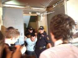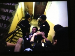 "На месте работает камера ГУВД Москвы. Хозяин квартиры кричит: "Я показал договор, что могу здесь проживать!" Кажется, в квартиру все-таки прошли. Адвокат Волкова сообщает, что осмотр квартиры проводится незаконно (оперативники во главе с мужчиной в сером — в квартире) и жалуется, что ее «кто-то ударил по руке и убежал". Полицейский пишет протокол", - оповещал в своем микроблоге Переверзев. Около 22.00 твит-трансляция обрывается. Позднее Переверзев сообщал, что полицейские жестко, с применением спецприемов обездвижили и препроводили в автозак всех находившихся в квартире мужчин.