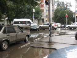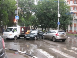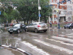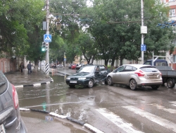 Два автолюбителя на "десятке" и "Форде" не смогли разъехаться на пересечении влажных от дождя центральной городской магистрали и Обуховского переулка.