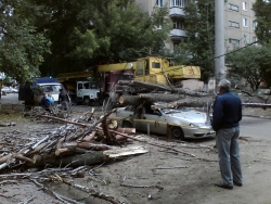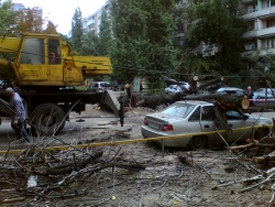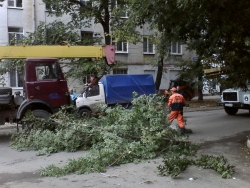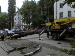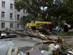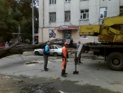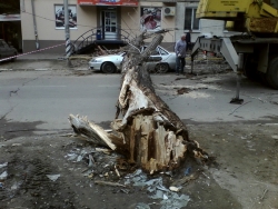 Как уточняет корреспондент с места событий, дерево все еще распиливают. Маршрутные такси и автомобили вынуждены объезжать перекрытый участок по смежным улицам. От падения дерева пострадал легковой автомобиль "Дэу Нексия".