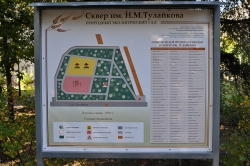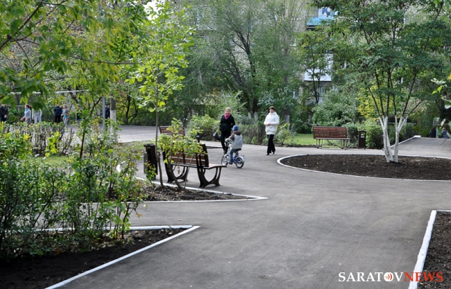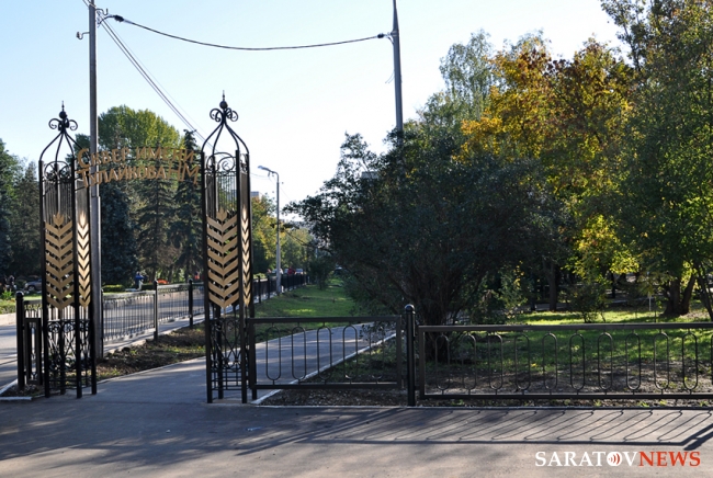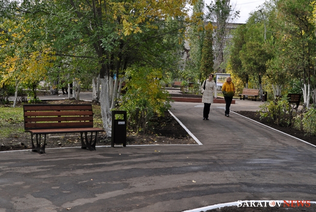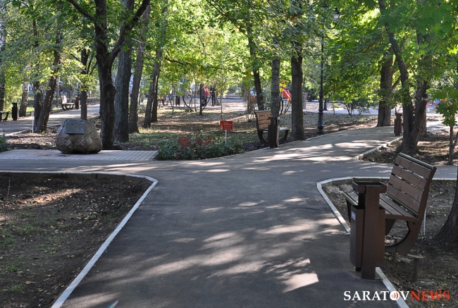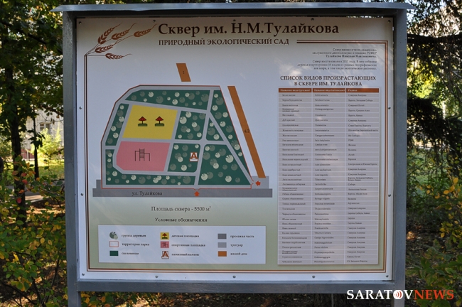 В сквере на Тулайкова Грищенко в первый раз побывал в конце июня. В неастоящее время благоустройство полностью завершено: заасфальтированы дорожки, установлены ограждение, лавочки, урны, большая детская площадка, новые фонари. По словам главы администрации Ленинского района Валерия Сараева, зеленую зону уже назвали природным экологическим садом, так как здесь совместно с дендрарием НИИ Юго-Востока высажены более 40 видов различных растений, перед каждым из саженцев поставлена табличка, объясняющая, что это за вид и где он произрастает в природе.