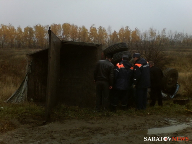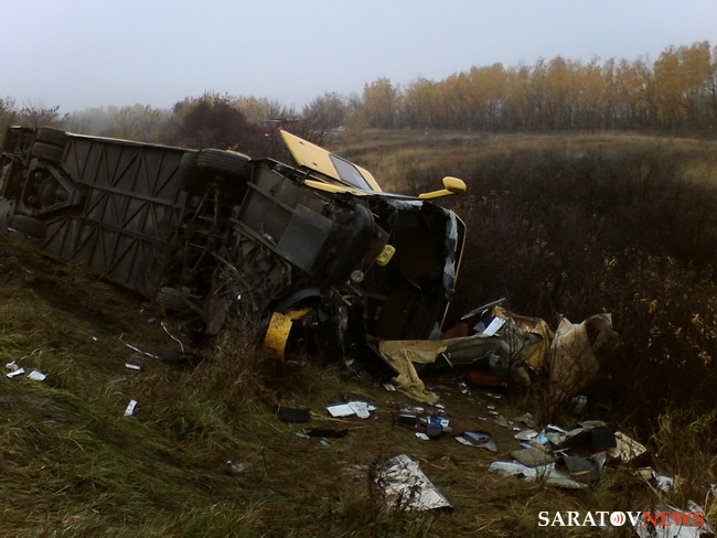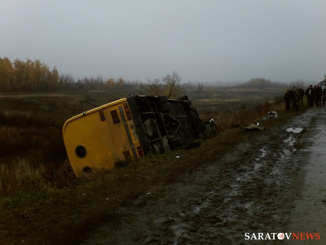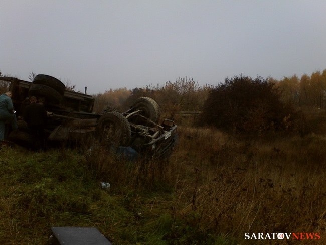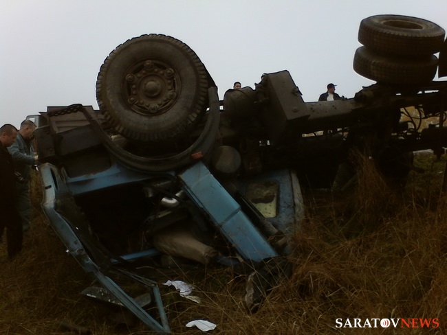 Вахтовый автобус и грузовик, столкнувшийся с ним на объездной Саратова, следовали в одном и том же направлении, сообщает с места событий корреспондент Saratovnews. По предварительной версии, "МАЗ" собирался поворачивать и не пропустил автобус. Автобус пошел на обгон и произошло столкновение. Теперь автобус и грузовик лежат на одной и той же обочине вне проезжей части. "МАЗ" перевернулся колесами вверх, автобус лежит на левом боку. У обоих транспортных средств саратовские номера.