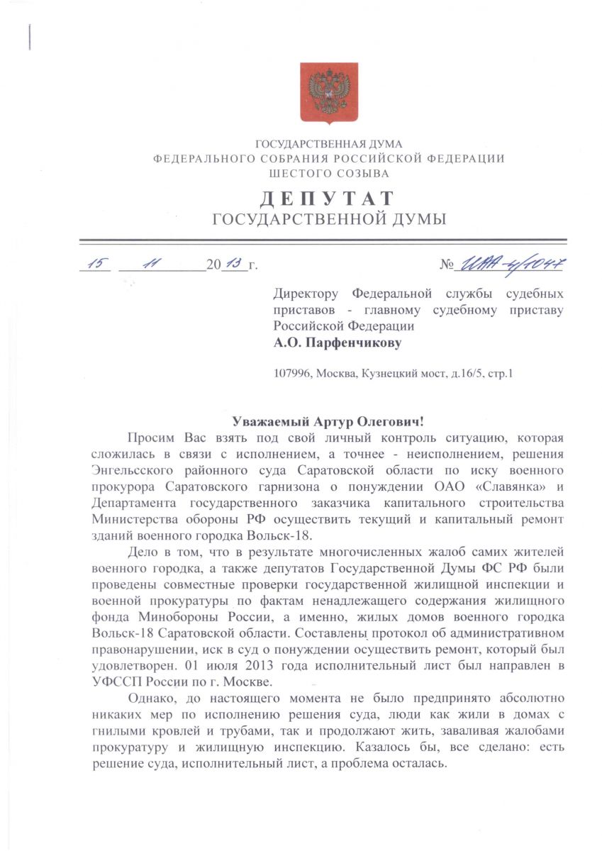 Депутаты Государственной Думы 6-го созыва от Саратовской области обратились к главе Федеральной службы судебных приставов Артуру Парфенчикову с просьбой посодействовать исполнению решения суда о ремонте жилых домов военного городка Вольск-18, сообщает пресс-служба регионального отделения ЛДПР. Под письмом подписались Антон Ищенко (ЛДПР), Ольга Баталина (ЕР), Николай Панков (ЕР), Василий Максимов (ЕР) и Ольга Алимова (КПРФ).