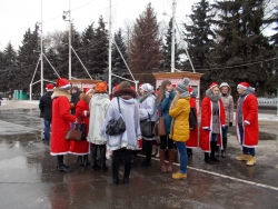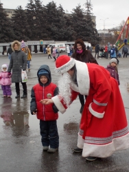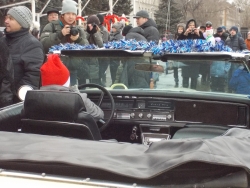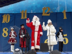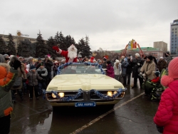 К концу представления на площади появились главные персонажи новогодних праздников Дед Мороз и Снегурочка. Они приветствовали участников мероприятия из открытого ретро-автомобиля. По традиции, волшебники совместно с горожанами зажгли главную елку города.