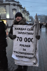 Организатором действа выступил молодой коммунист Николай Бондаенко. Вместе с ним по проспекту прошлись депутат городской думы Геннадий Турунтаев, руководитель саратовского регионального отделения КПРФ Александр Анидалов и их единомышленники, всего чуть более десяти человек. Коммунисты поставили перед собой задачу высмеять чрезмерное усиление мер безопасности во время проведения саратовского этапа эстафеты и привлечь внимание к "распилу бюджета", который, по их мнению, имеет место быть в схеме финансирования олимпийских объектов. Несколько активистов изображали автоматчиков, Бондаренко трусцой бежал с картонной копией факела в руках, Турунтаев раздавал листовки, Анидалов зачитывал в мегафон обращение к саратовцам. Он упоминал цифры, согласно которым Олимпиада-2014 в Сочи на порядок дороже всех проводившихся прежде зимних олимпиад, и приводил варианты, как еще можно было бы потратить бюджетные средства, если бы олимпиада в Сочи обошлась хотя бы в такую же сумму, что и прошлая ванкуверская, 2010-го года. "Мы не против Олимпиады, мы не против спорта, мы против коррупции и распила", - говорил Анидалов. В это время Бондаренко изображал "коррумпированного факелоносца»: призывал полицейских арестовывать прохожих, которые не изображают радость при виде факела, пересажать в ИВС журналистов, а также предлагал всем желающим купить место среди факелоносцев за 40 тысяч рублей. Его сопровождал коммунист, изображающий сотрудника ФСО, с огромной зажигалкой "Зиппо". Впереди шел непременный участник коммунистических перфомансов – "медведь-единоросс". Временами из колонны шествия слышались крики "Факел потух!" или "Факелоносец загорелся!"