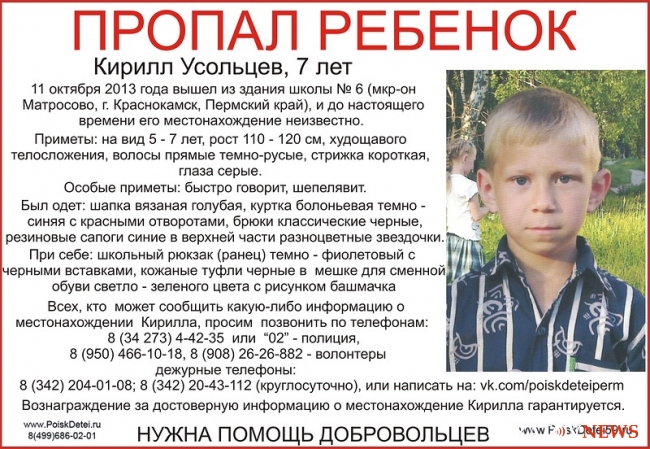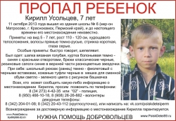 7-летний Кирилл Усольцев 11 октября вышел из школы №6, которая находится в микрорайоне Матросово Краснокамска Пермского края и бесследно исчез. До сих пор не обнаружено никаких улик или зацепок, которые могли бы привести к пониманию, что случилось с ребенком.