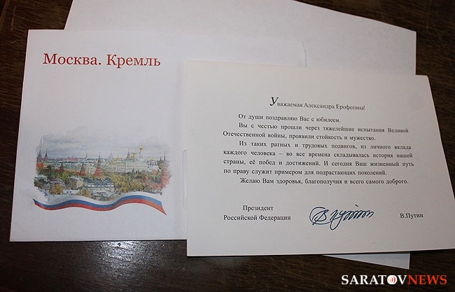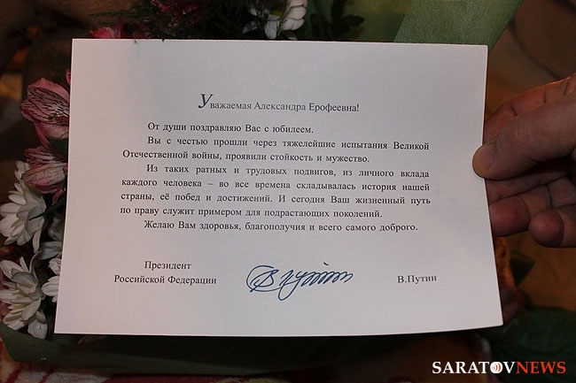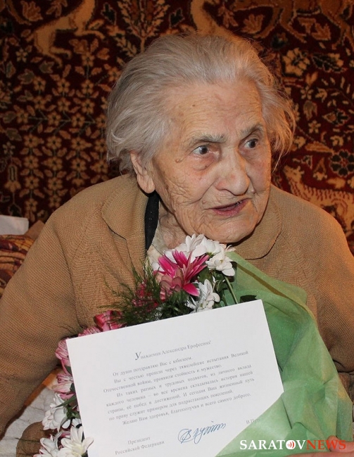 Родственники пенсионерки отметили: "Такое внимание очень приятно. В этот день поздравления приходят от всех родственников и друзей, с которыми Александра Ерофеевна поддерживает связь. Она очень общительный человек, следит за жизнью страны, слушает новости и "болеет" за нашу Олимпийскую сборную. Также интересуется жизнью Саратовской губернии. Она единственный долгожитель в нашей семье. Мы ее очень любим и желаем ей огромного здоровья".