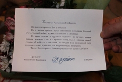 В день своего столетия жительница Фрунзенского района Саратова Александра Иванова получила персональное поздравление от президента России Владимира Путина, сообщает пресс-служба районной администрации. Также ветерана Великой Отечественной войны поздравили заместитель главы администрации Фрунзенского района Саратова по социальной сфере Николай Дмитриев и председатель районного Совета ветеранов Бронислав Костальцев.