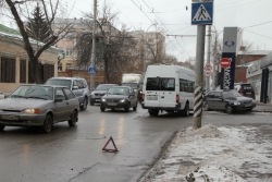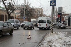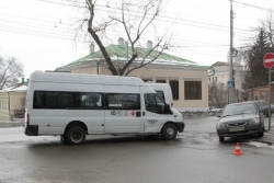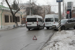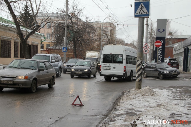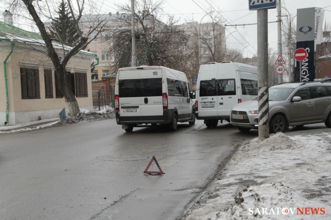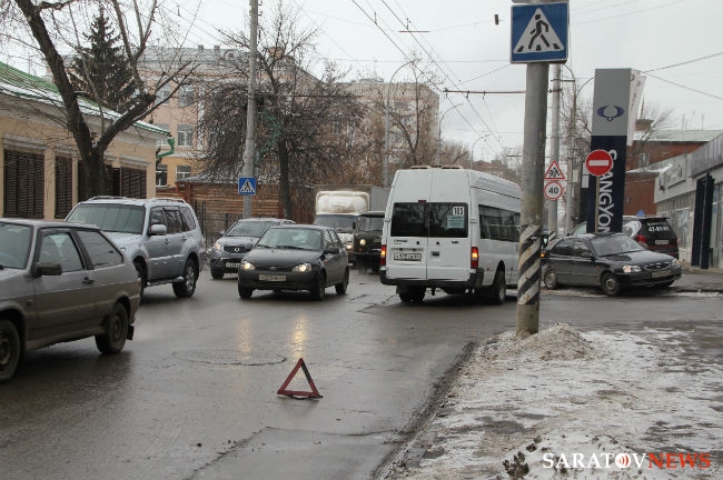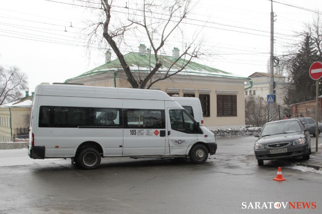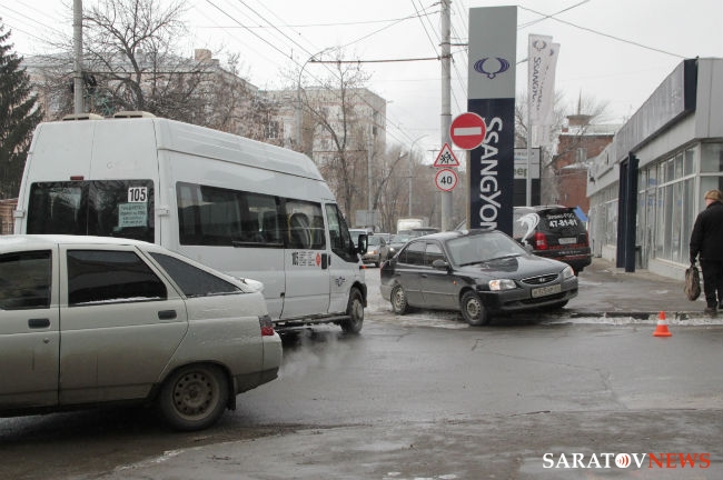 Сегодня в Саратове на пересечении улиц Чернышевского и Некрасова произошло столкновение микроавтобуса — маршрутного такси №105 и легкового автомобиля "Хундай". У автобуса помята правая дверь водительской кабины, на "Хундае" вмятина правого крыла ближе к багажнику. Маршрутка следовала по выделенной полосе общественного транспорта по направлению к Заводскому району.