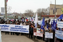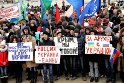 В руках у митингующих были элементы национальной одежды Украины и лозунги: "Россия и Украины – едины!", "Крым, мы с тобой!", "За дружбу с Украиной", "Слава Беркуту!" и другие.