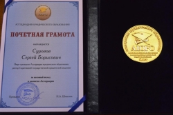 В ходе заседания ректор СГЮА Сергей Суровов в торжественной обстановке был награжден Почетной грамотой АЮРО "За вклад в развитие Ассоциации" и медалью УМО по юридическому образованию вузов РФ.