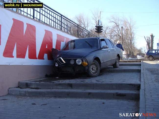 Сегодня в Вольске Саратовской области БМВ вылетел на тротуар и врезался в стену, передает Wolsk.ru. ДТП произошло около 16.00 на пешеходной часть улицы Ленина около ТЦ "Апельсин" и Центрального рынка. Иномарка снесла вывеску мясного магазина и врезалась в стену с баннером супермаркета "Магнит". Легковушка проехаа больше десяти метров по тротуару и чудом не сбила ни одного пешехода.