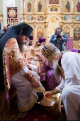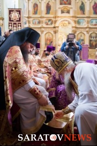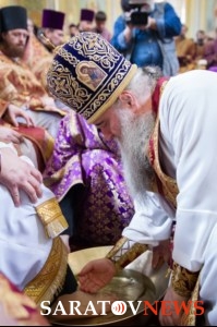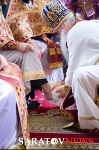 Вчера, 17 апреля, когда православные отмечают Великий Четверг перед Пасхой, в храме в честь Покрова Богородицы Саратова митрополит Лонгин после литургии совершил Чин умовения ног, сообщает пресс-служба епархии. Этот церковный ритуал появился в Иерусалиме в VI–VII веках. По православной традиции, его проводят один раз в год. Судь ритуала в том, что архиерей омывает ноги двенадцати другим участникам чина, как Христос умыл ноги двенадцати ученикам на Тайной Вечере.