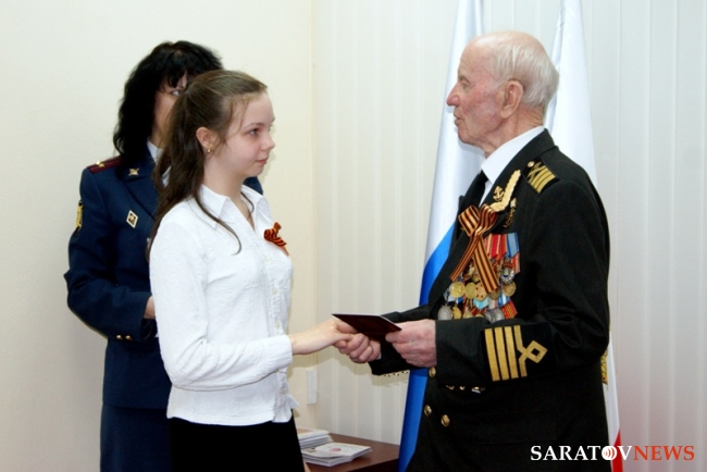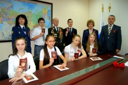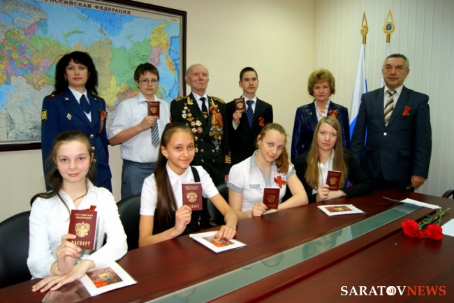 В приемной президента РФ в Саратовской области прошло торжественное вручение паспортов школьникам, сообщает пресс-служба УФМС по региону. В мероприятии приняли участие: участник ВОВ Михаил Кудряшов, председатель областного Совета ветеранов войны Таисия Якименко, начальник отдела обеспечения паспортной и регистрационной работы УФМС по области Ирина Крымская, советник главного федерального инспектора по области Анатолий Седов.