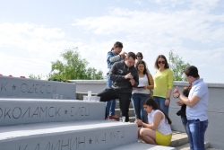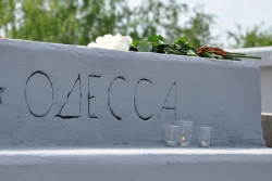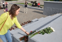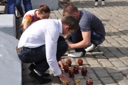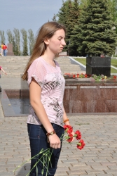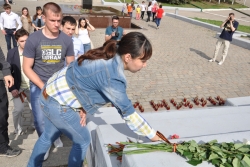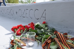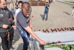 Участники прошли к подножию мемориала "Журавли", где возложили цветы и поставили лампады со свечами к ступени, посвященной Одессе. Было сказано несколько слов о том, что погибшие 2 мая "защищали весь мир от фашизма". Затем молодые люди прошли вокруг монумента и сфотографировались на память.
