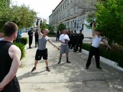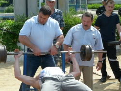 В программу мероприятий было включено перетягивание каната, жим штанги (80 кг) лежа, приседания со штангой (90 кг), работа с гирями.