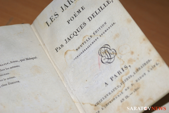 Сотрудники УФСБ по Саратовской области вернули Радищевскому мсузею книгу 1801 года выпуска Ж. Делиля "Les Jardins", судьба которой оставалась неизвестной на протяжении 40 лет после похищения ряда книг из фонда учреждения. Контрразведчикам удалось убедить добровольно вернуть раритет законным владельцам 44-летнего любителя редкостей. По его словам, издание он обнаружил при разборе завалов заброшенного дома в центре Саратова. На страницах реликвии имеются следы подчисток печатей и штампов Радищевского музея, а также на обложке сохранился инвентарный номер - 4901.