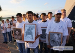 Участники мероприятия зажгли свечи в рамках всероссийской акции "Свеча памяти" и провели "Бессмертный полк" - молодые люди встали в строй с портретами воинов, не вернувшихся из битв Великой Отечественной войны.