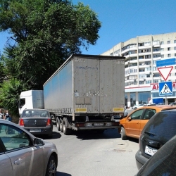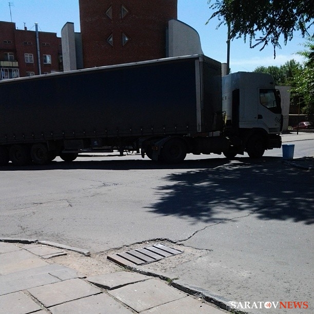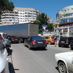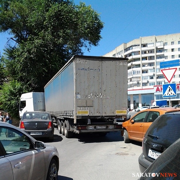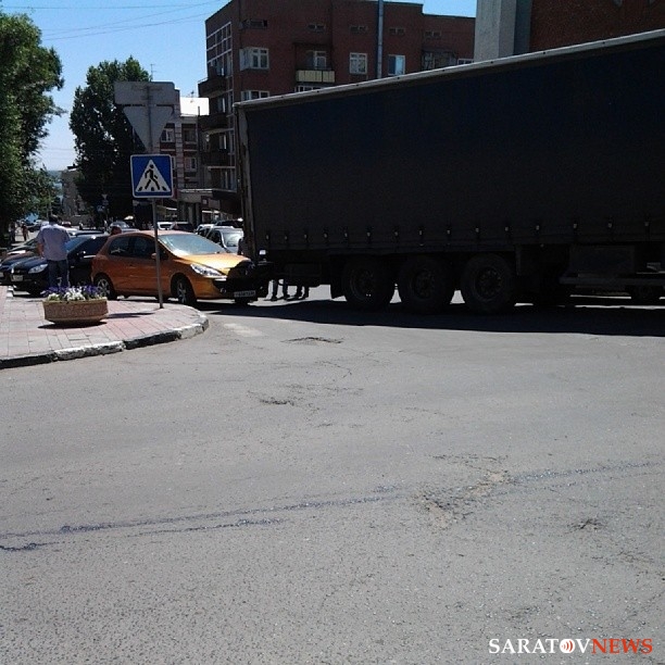 Сегодня на перекрестке улиц Октябрьская и Мичурина в Саратове произошло ДТП: большегруз, двигаясь со стороны Волги и выполняя левый поворот с Октябрьской на Мичурина, зацепил припаркованный на перекрестке "Пежо". В результате у легковушки наполовину оторван передний бампер, а автофургон встал посредине перекрестка, полностью блокировав движение и по Мичурина, и по Октябрьской. С трудом малогабаритные авто могут проезжать только по узкой полоске проезжей части, поворачивая с Октябрьской на Мичурина. В районе ДТП образуется затор.