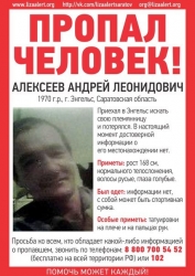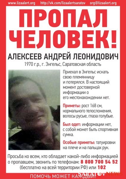Сообщается, что 44-летний Андрей Алексеев - мужчина 168 см ростом, русоволос и голубоглаз. Информации о том, как мужчина был одет, не имеется, но при себе может носить спортивную сумку. На плече и на пальцах рук - татуировки. "Возможно, бомжует", - отмечают активисты Лизы Алерт.