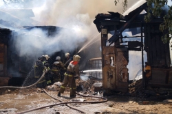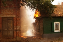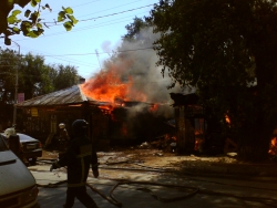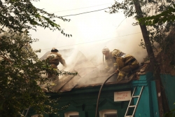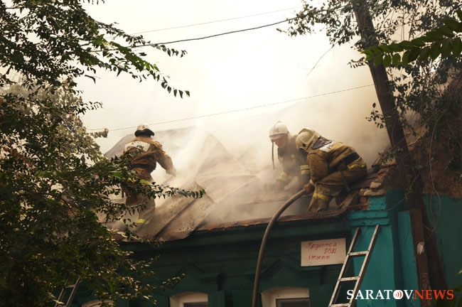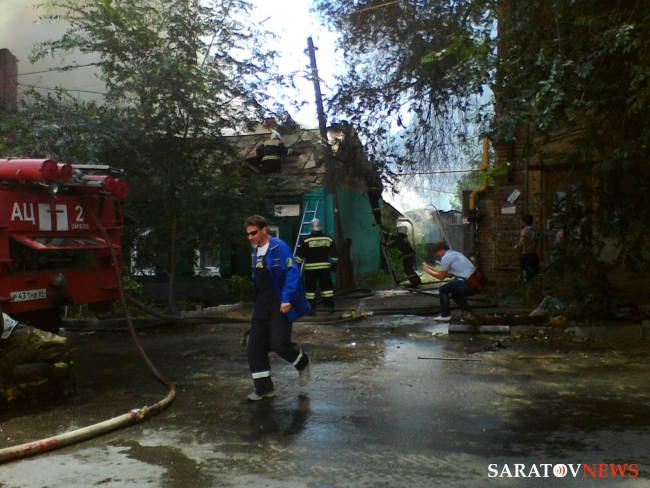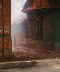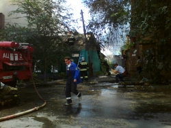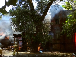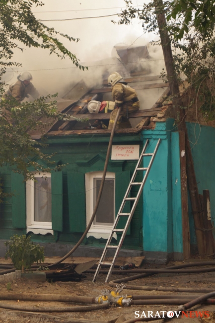 Сейчас огнеборцы пытаются не допустить дальнейшего распространения огня. Один из домов уже практически догорел, со второго снимают крышу, чтобы залить водой внутренние конструкции.