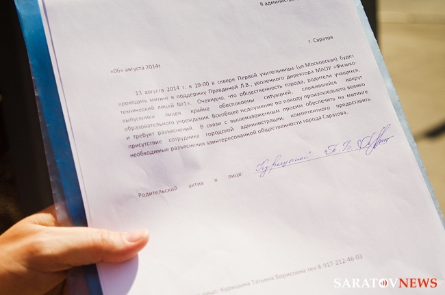 13 августа в 19.00 в сквере Первой учительницы на ул. Соляной в Саратове пройдет митинг в поддержку Людмилы Правдиной, уволенного директора физико-технического лицея №1. Мероприятие уже согласовала мэрия, но сегодня, 6 августа, в администрацию Саратова направили дополнительную просьбу от организаторов. "Нам нужен саратовский чиновник, в компетенции которого будет дать ответы на наши вопросы. Мы хотим, чтобы этот специалист пришел к нам на митинг, пообщался с его участниками, представителями заинтересованной общественности, от имени городских властей, - объяснила активистка, мать одного из учеников ФТЛ Татьяна Курицына. - Идеально было бы, если бы это была глава городского комитета образования Ирина Архипова".