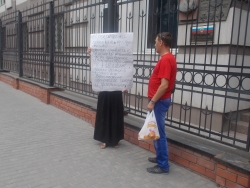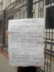 Сегодня днем возле здания СУ СКР по Саратовской области был замечен одиночный пикет. Женщина стояла с плакатом: "Прекратите покрывать преступления! Требую привлечь к уголовной ответственности преступника-фальсификатора следователя К.А. Мишина, зверски избившего человека из-за вероисповедания. Прекратите геноцид и дискриминацию".